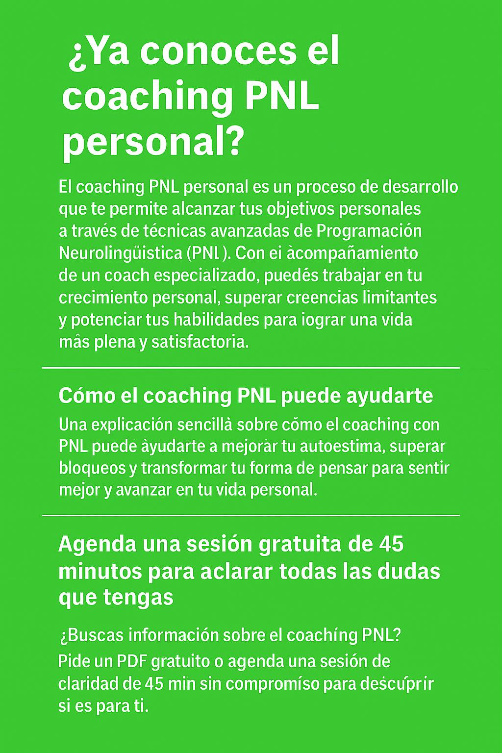 Estoy súper agradecida a Xavier y al Coaching PNL por mostrarme lo fuerte que soy por dentro. ¡Ahora sé cómo manejar mis emociones para mejorar mis relaciones y afrontar las cosas de otra manera, con más paz! Gracias a personas como tú, Xavier, que motivan e inspiran, el mundo avanza. Has convertido la escucha activa en un verdadero arte, ¡un regalo! Gracias por tu paciencia y comprensión en todo momento, tanto en los buenos como en los malos. 😊