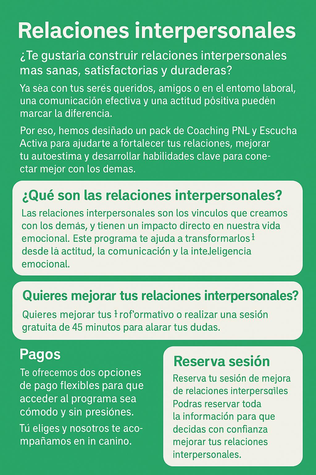 Estoy feliz! A mitad del programa de mejora de relaciones interpersonales y ya siento un cambio increíble. Ahora conecto de verdad con la gente, escucho mejor y me expreso con más seguridad. ¡Una experiencia transformadora!